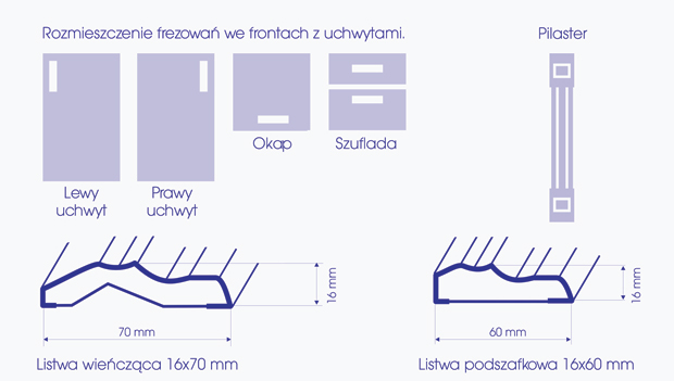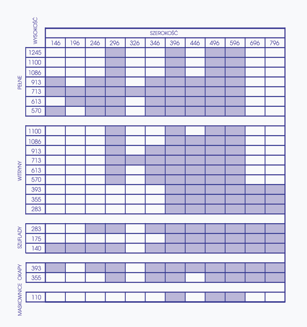 Wykonujemy fronty w wymiarach niestandardowych z zachowaniem maksymalnej szerokości 1245 mm i wysokości 2350 mm; minimalna wysokość 100 mm i szerokość 50 mm. Listwy wieńczące i podszafkowe maksymalna długość 2400 mm.